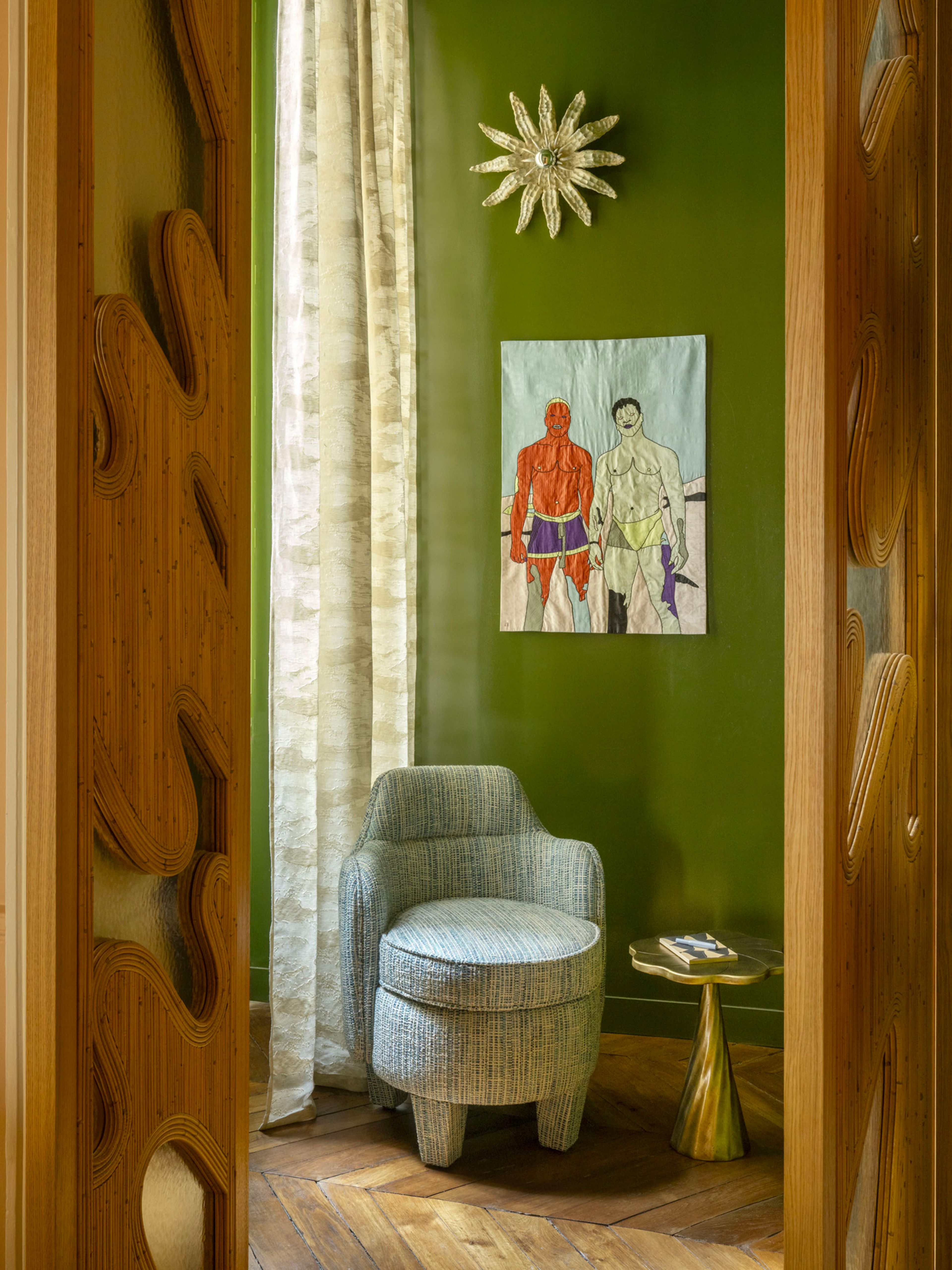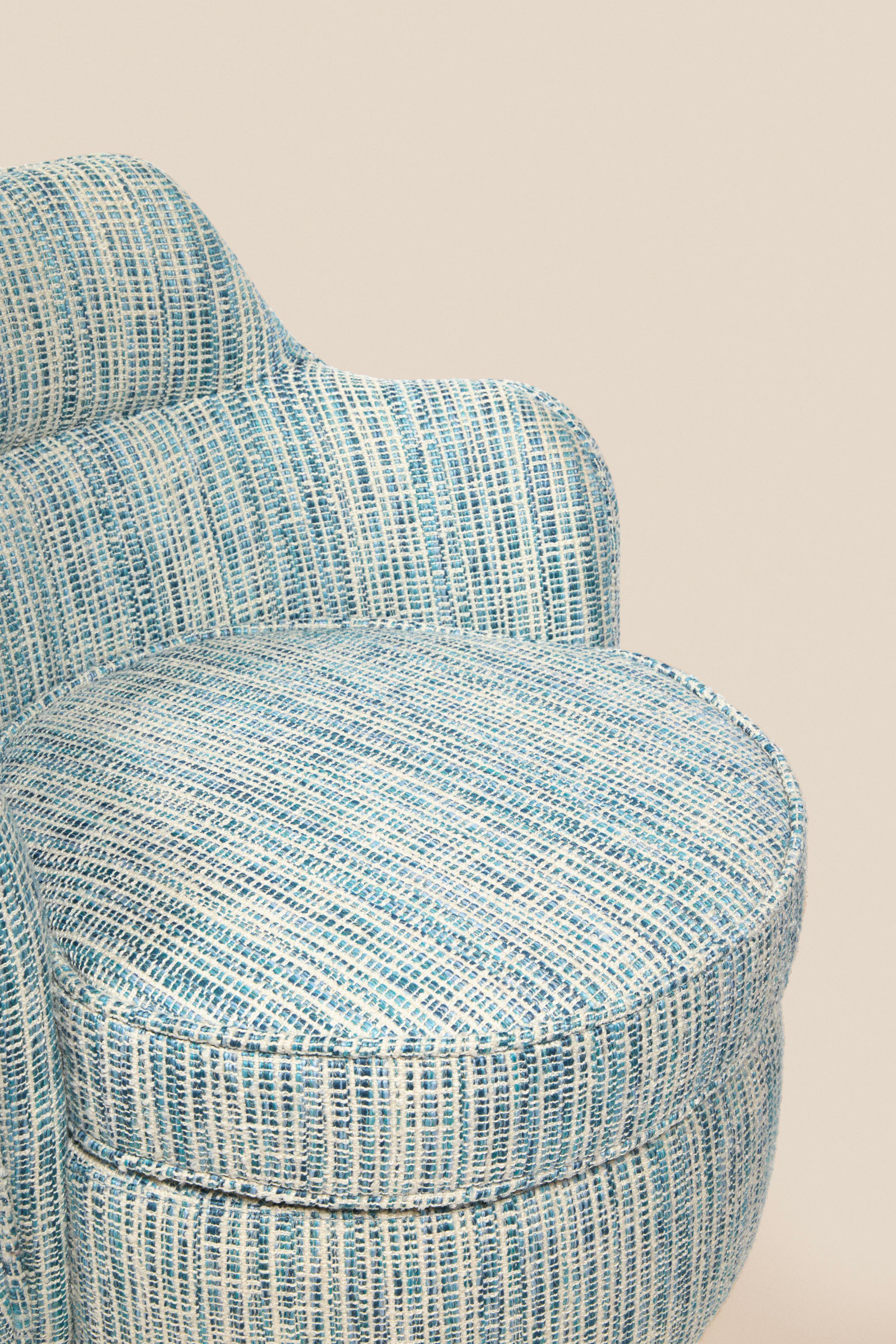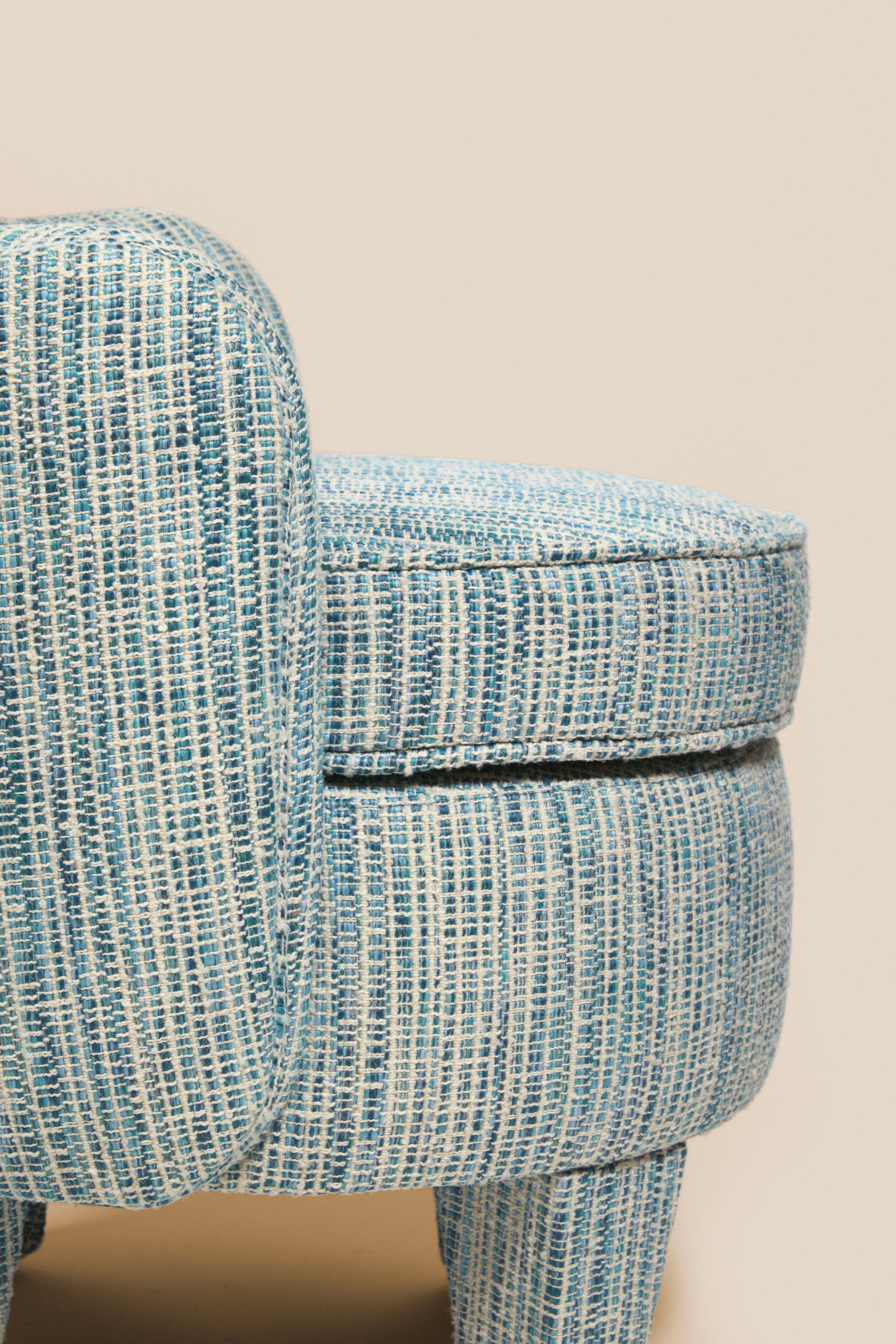 This compact armchair with its geometric design is upholstered in Larsen Sesta Marine cotton and linen, giving it an elegant, natural texture.